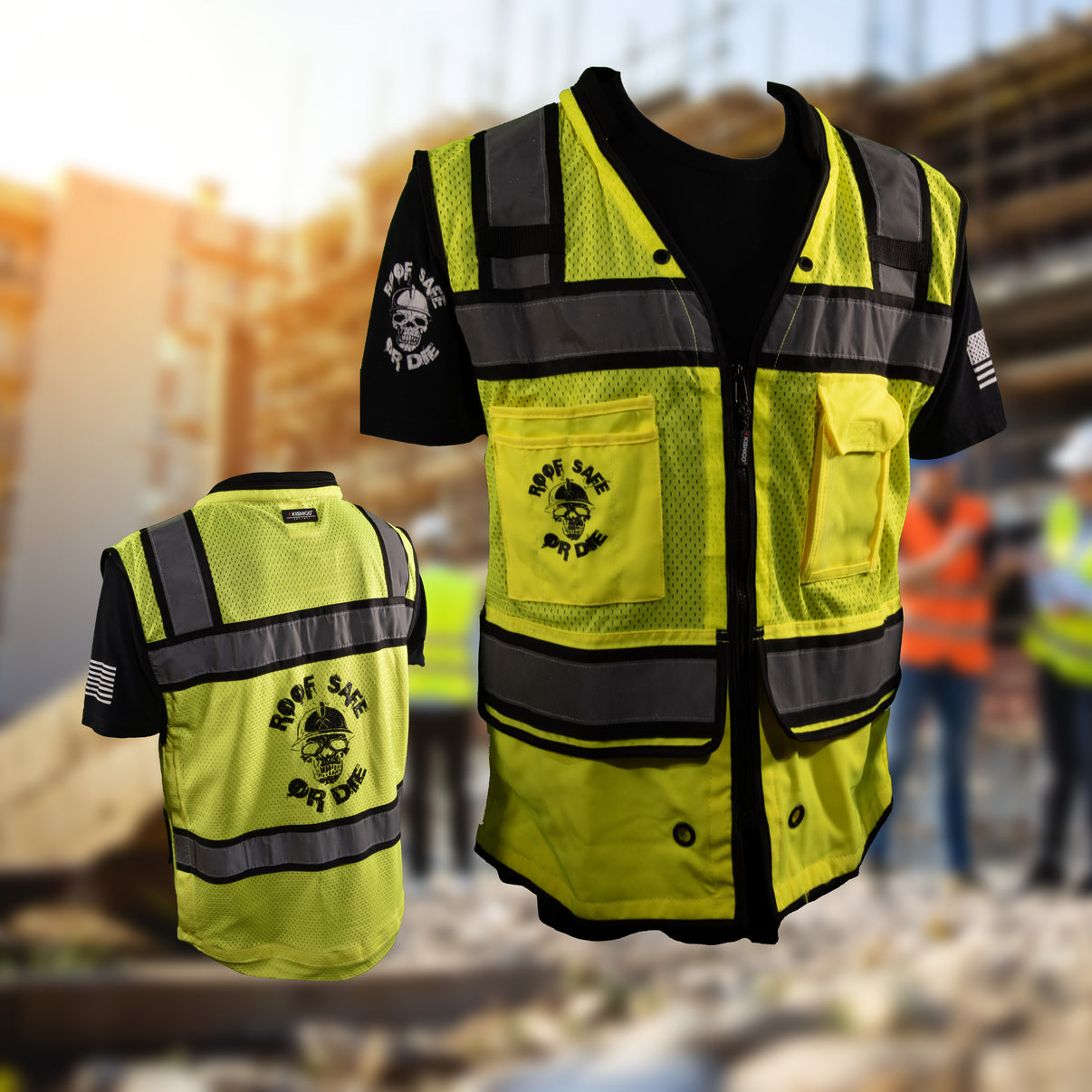 Ultra-Cool 100% polyester mesh. Brilliant Trim reflective edging improves low light visibility. Plastic zipper front closure reinforced with durable webbing. 2 inch wide high performance reflective material with 3 inch breathable contrasting color. Left and right chest mic tabs (size small only has left mic tab). Two lower outside cargo pockets with grommets and adjustable flaps. Right chest 2-tier pencil pocket. Left chest radio pocket with flap. Two inside patch pockets.